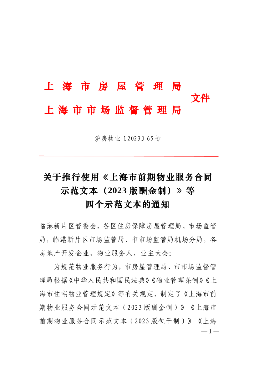 为规范物业服务行为,市房屋管理局、市市场监督管理局根据《中华人民共和国民法典》《物业管理条例》《上海市住宅物业管理规定》等有关规定,制定了《上海市前期物业服务合同示范文本(2023版酬金制)》《上海市前期物业服务合同示范文本(2023版包干制)》《上海市物业服务合同示范文本(2023版酬金制)》《上海市物业服务合同示范文本(2023版包干制)》(以下统称《物业服务合同》),现予印发,自2023年7月1日起在全市范围内推行使用。现就有关事项通知如下: