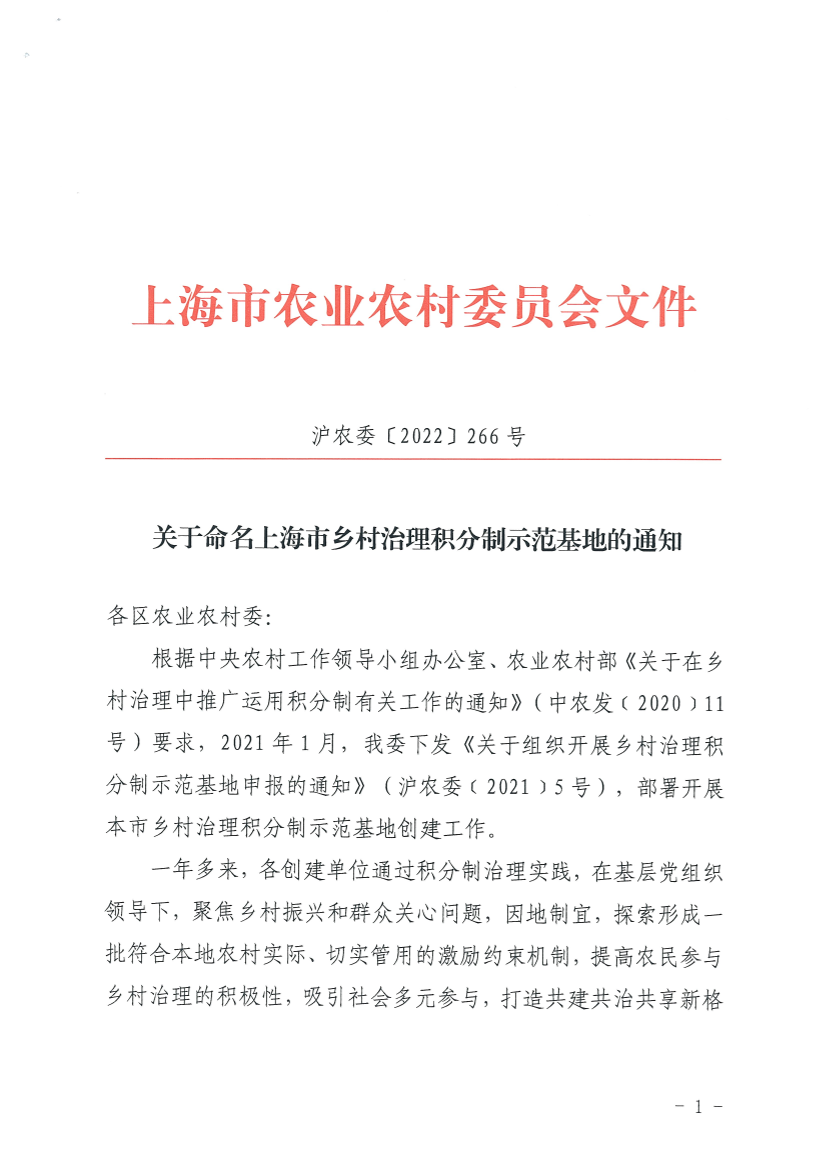 根据中央农村工作领导小组办公室、农业农村部《关于在乡村治理中推广运用积分制有关工作的通知》(中农发﹝2020﹞11号)要求,2021年1月,我委下发《关于组织开展乡村治理积分制示范基地申报的通知》(沪农委﹝2021﹞5号),部署开展本市乡村治理积分制示范基地创建工作。