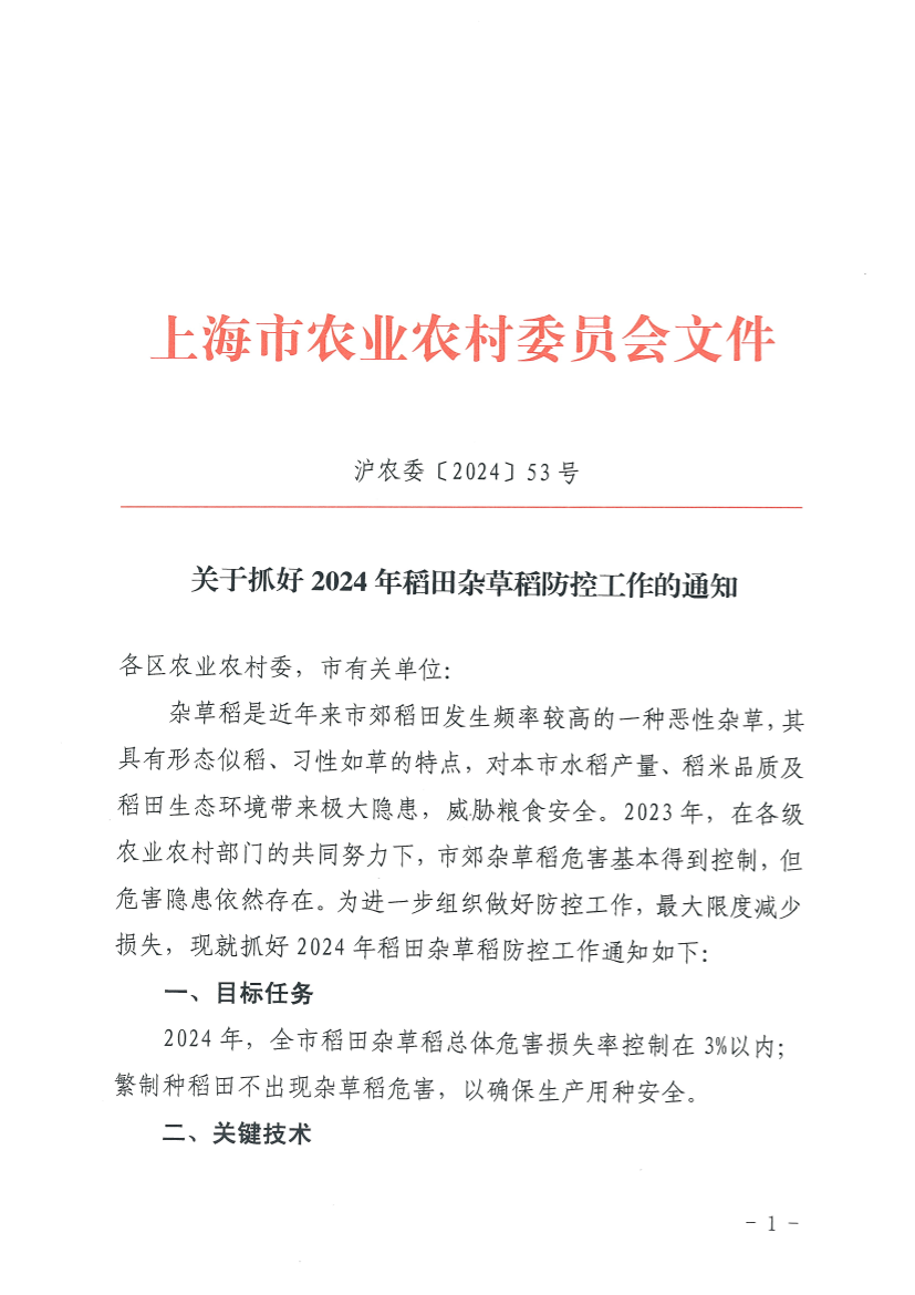 杂草稻是近年来市郊稻田发生频率较高的一种恶性杂草,其具有形态似稻、习性如草的特点,对本市水稻产量、稻米品质及稻田生态环境带来极大隐患,威胁粮食安全。2023年,在各级农业农村部门的共同努力下,市郊杂草稻危害基本得到控制,但危害隐患依然存在。为进一步组织做好防控工作,最大限度减少损失,现就抓好2024年稻田杂草稻防控工作通知如下: