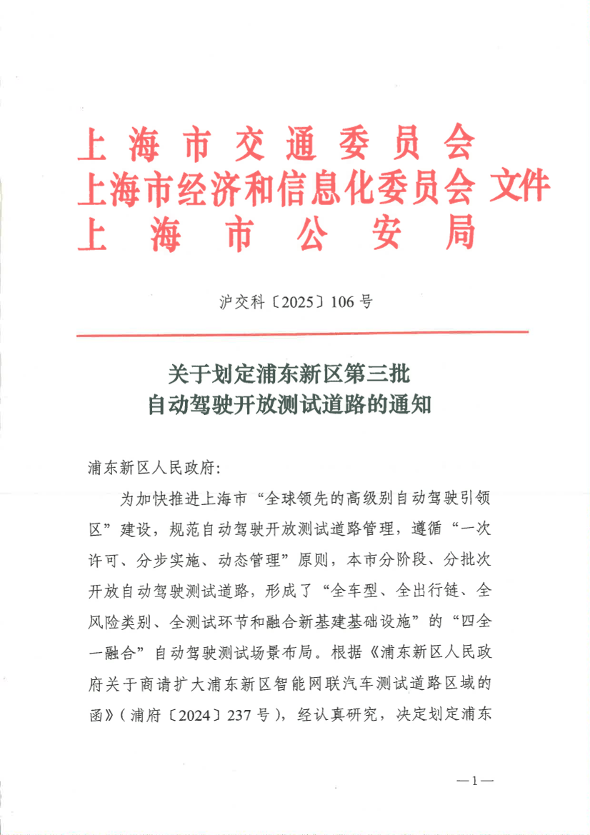 为加快推进上海市“全球领先的高级别自动驾驶引领区”建设,规范自动驾驶开放测试道路管理,遵循“一次许可、分步实施、动态管理”原则,本市分阶段、分批次开放自动驾驶测试道路,形成了“全车型、全出行链、全风险类别、全测试环节和融合新基建基础设施”的“四全一融合”自动驾驶测试场景布局。根据《浦东新区人民政府关于商请扩大浦东新区智能网联汽车测试道路区域的函》(浦府〔2024〕237号),经认真研究,决定划定浦东新区第三批自动驾驶开放测试道路,具体通知如下: