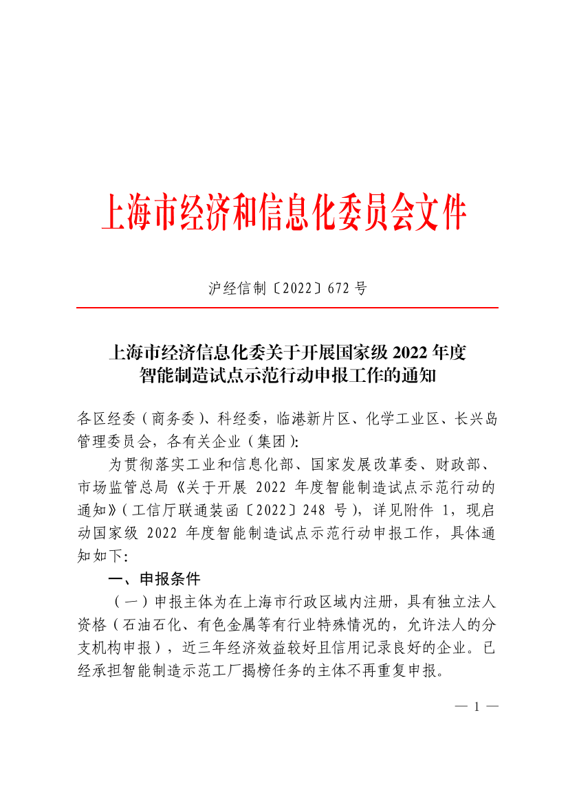 为贯彻落实工业和信息化部、国家发展改革委、财政部、市场监管总局《关于开展2022年度智能制造试点示范行动的通知》(工信厅联通装函〔2022〕248号),详见附件1,现启动国家级2022年度智能制造试点示范行动申报工作,具体通知如下: