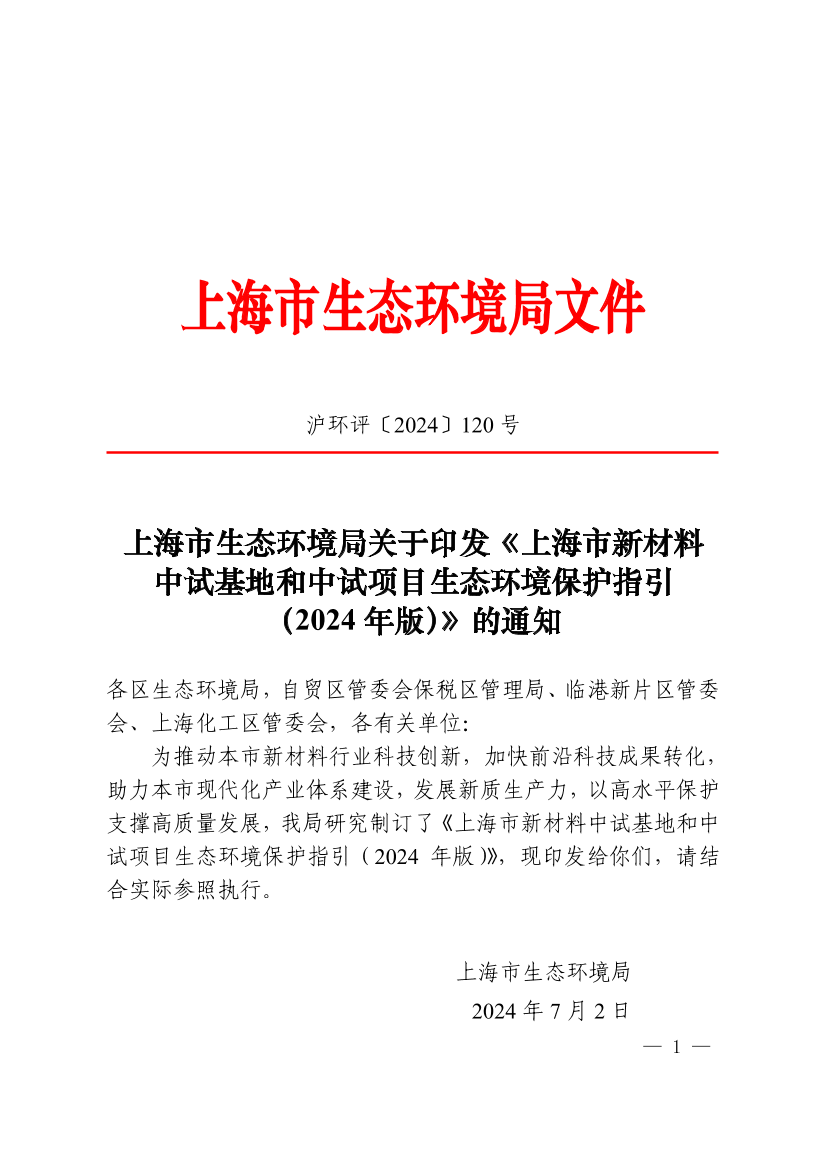 《上海市新材料中试基地和中试项目生态环境保护指引(2024年版)》