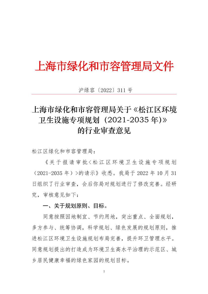 《关于报请审批<松江区环境卫生设施专项规划(2021-2035年)>的请示》收悉。我局于2022年10月31日组织了行业审查,会后你局对规划进行了修改完善。经研究,审核意见如下: