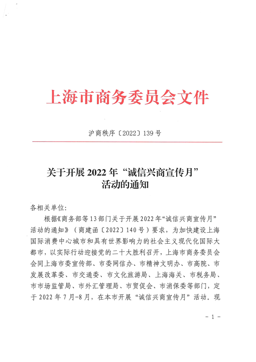 根据《商务部等13部门关于开展2022年“诚信兴商宣传月”活动的通知》(商建函〔2022〕140号)要求,为加快建设上海国际消费中心城市和具有世界影响力的社会主义现代化国际大都市,以实际行动迎接党的二十大胜利召开,上海市商务委员会会同上海市委宣传部、市委网信办、市精神文明办、市高院、市发展改革委、市交通委、市文化旅游局、上海海关、市税务局、市市场监管局、市外汇管理局、市贸促会、市消保委等部门,定于2022年7月-8月,在本市开展“诚信兴商宣传月”活动。现将有关事项通知如下:
