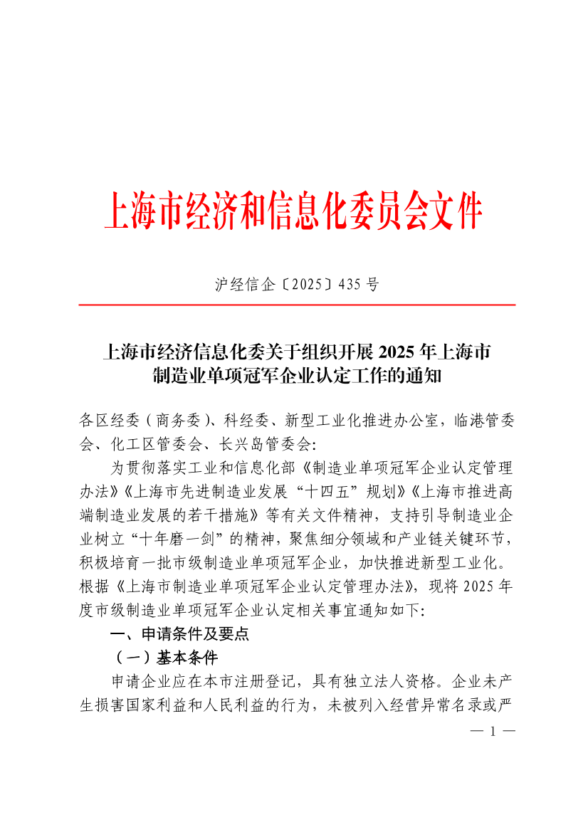 为贯彻落实工业和信息化部《制造业单项冠军企业认定管理办法》《上海市先进制造业发展“十四五”规划》《上海市推进高端制造业发展的若干措施》等有关文件精神,支持引导制造业企业树立“十年磨一剑”的精神,聚焦细分领域和产业链关键环节,积极培育一批市级制造业单项冠军企业,加快推进新型工业化。根据《上海市制造业单项冠军企业认定管理办法》,现将2025年度市级制造业单项冠军企业认定相关事宜通知如下: