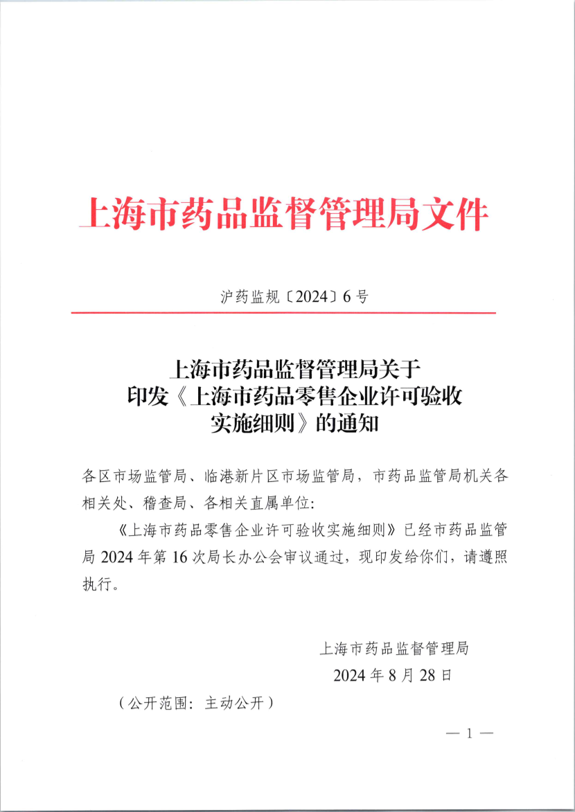 《上海市药品零售企业许可验收实施细则》已经市药品监管局2024年第16次局长办公会审议通过,现印发给你们,请遵照执行。