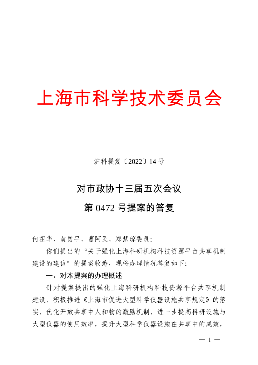 你们提出的“关于强化上海科研机构科技资源平台共享机制建设的建议”的提案收悉,现将办理情况答复如下:
