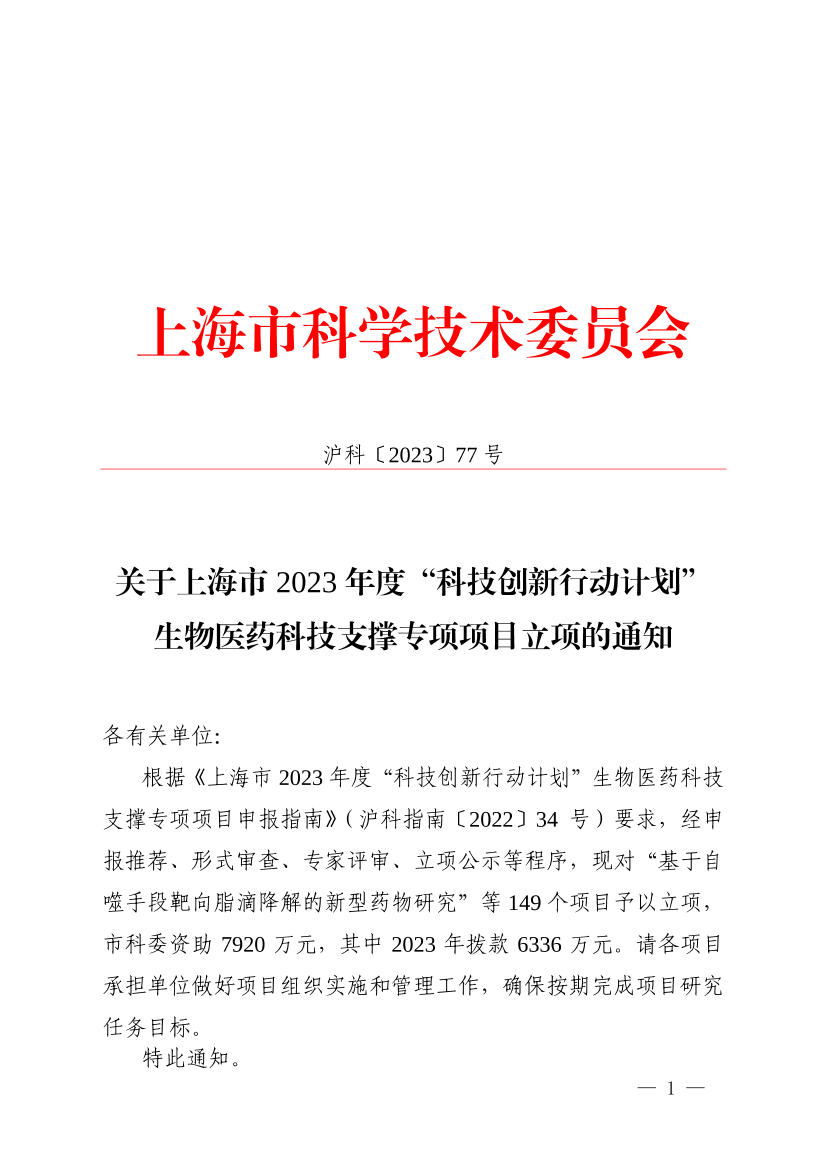 根据《上海市2023年度“科技创新行动计划”生物医药科技支撑专项项目申报指南》(沪科指南〔2022〕34号)要求,经申报推荐、形式审查、专家评审、立项公示等程序,现对“基于自噬手段靶向脂滴降解的新型药物研究”等149个项目予以立项,市科委资助7920万元,其中2023年拨款6336万元。请各项目承担单位做好项目组织实施和管理工作,确保按期完成项目研究任务目标。