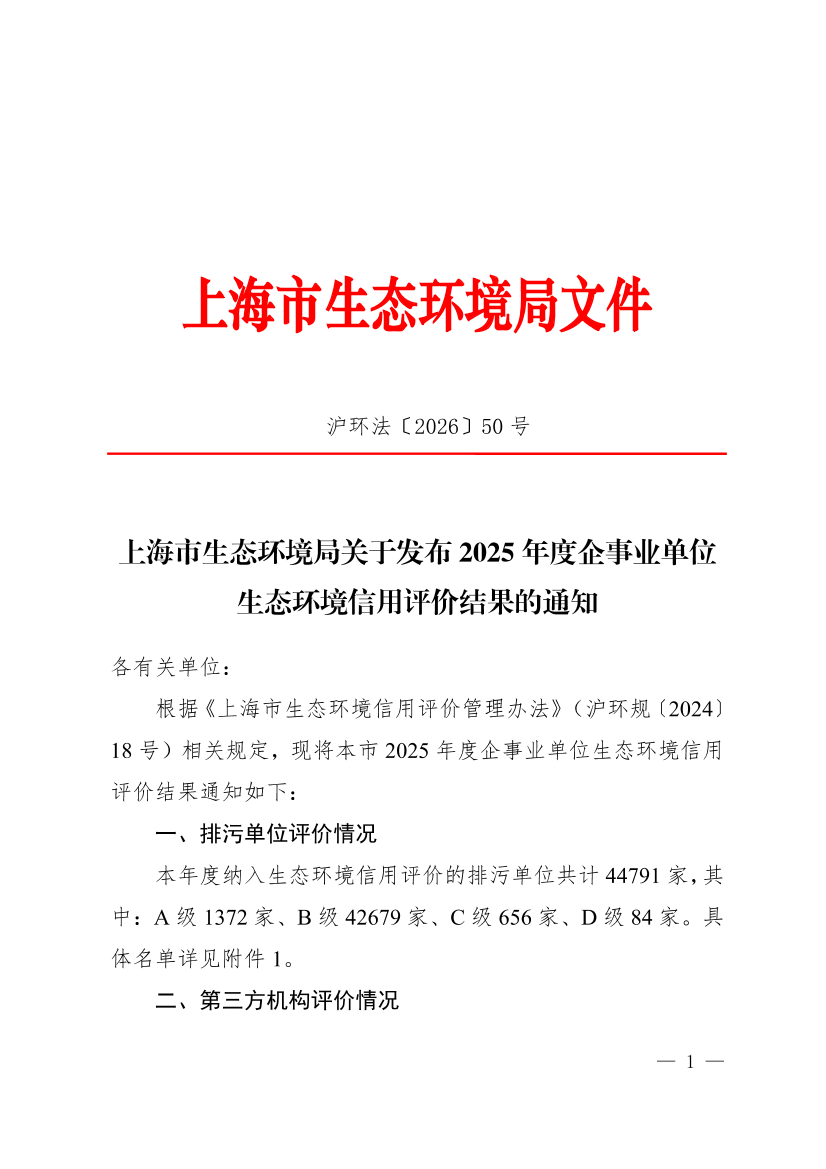 根据《上海市生态环境信用评价管理办法》(沪环规〔2024〕18号)相关规定,现将本市2025年度企事业单位生态环境信用评价结果通知如下: