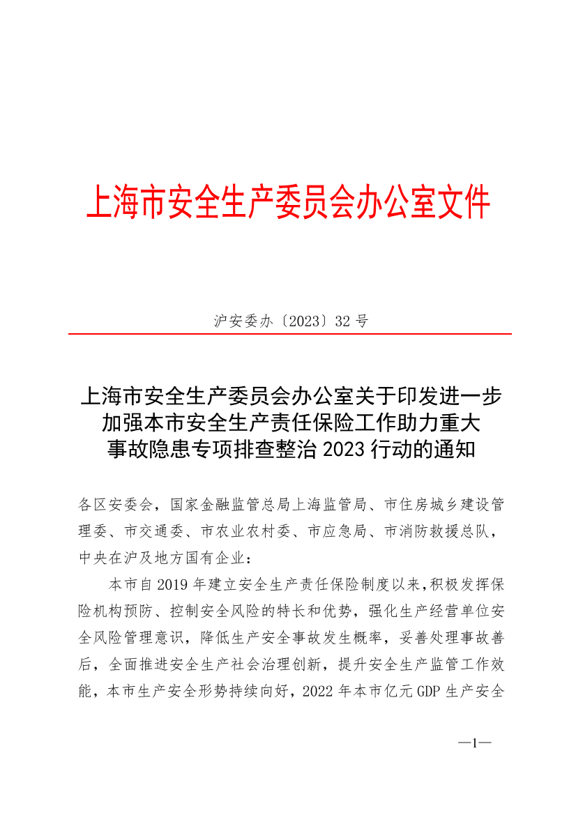 今年,国务院安委会部署开展全国重大事故隐患专项排查整治2023行动,着力推动从根本上消除隐患、从根本上解决问题,推动安全生产治理模式向事前预防转型,坚决守牢兜住安全发展底线,以高水平安全保障高质量发展。《上海市重大事故隐患专项排查整治2023行动工作方案》,对各区、相关部门督促推动企业落实主体责任,认真排查和整改重大事故隐患明确了目标和责任。按照《应急管理部办公厅 国家金融监管总局办公厅关于充分发挥安全生产责任保险功能作用助力全国重大事故隐患专项排查整治2023行动的通知》(应急厅函〔2023〕169号)有关要求,安全生产责任保险等具有事故预防服务功能的相关责任保险(以下统称安责险)作为安全生产综合治理的重要抓手,应当在安全生产工作中发挥更为重要的作用。现就本市进一步做好有关工作通知如下。