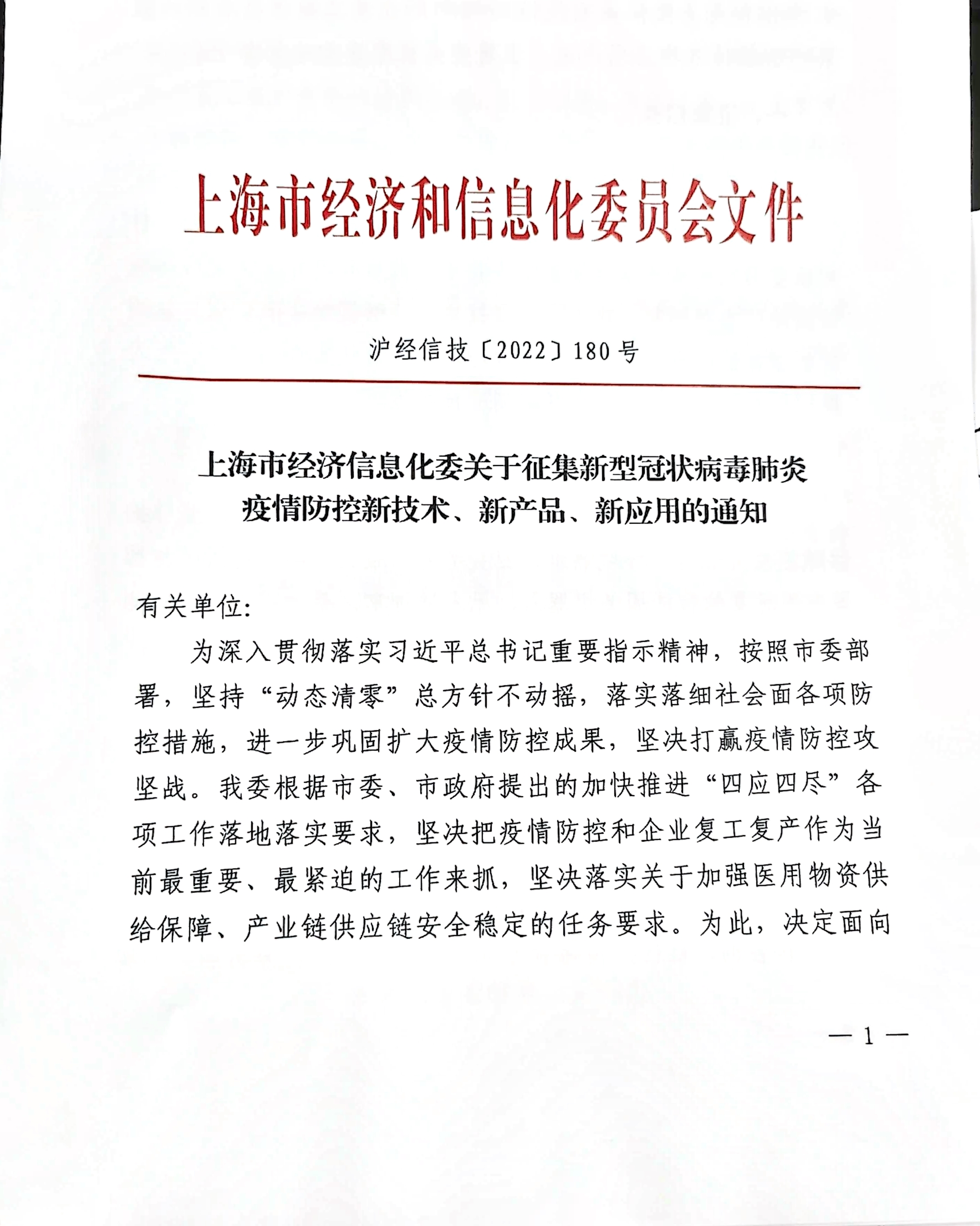 为贯彻落实习近平总书记关于应对新型冠状病毒感染的肺炎疫情的重要指示精神,坚持“动态清零”总方针不动摇,根据上海市委市政府提出加快推进“四应四尽”各项工作落地落实,我委切实把疫情防控和企业复工复产作为当前最重要、最紧迫的工作来抓,坚决落实关于加强医用物资供给保障、产业链供应链安全稳定的任务要求。为进一步把落实工作抓实抓细,现决定面向本市各有关单位征集对疫情防控和产业复工复产具有明确效果的创新技术和应用产品,现将有关征集事项通知如下: