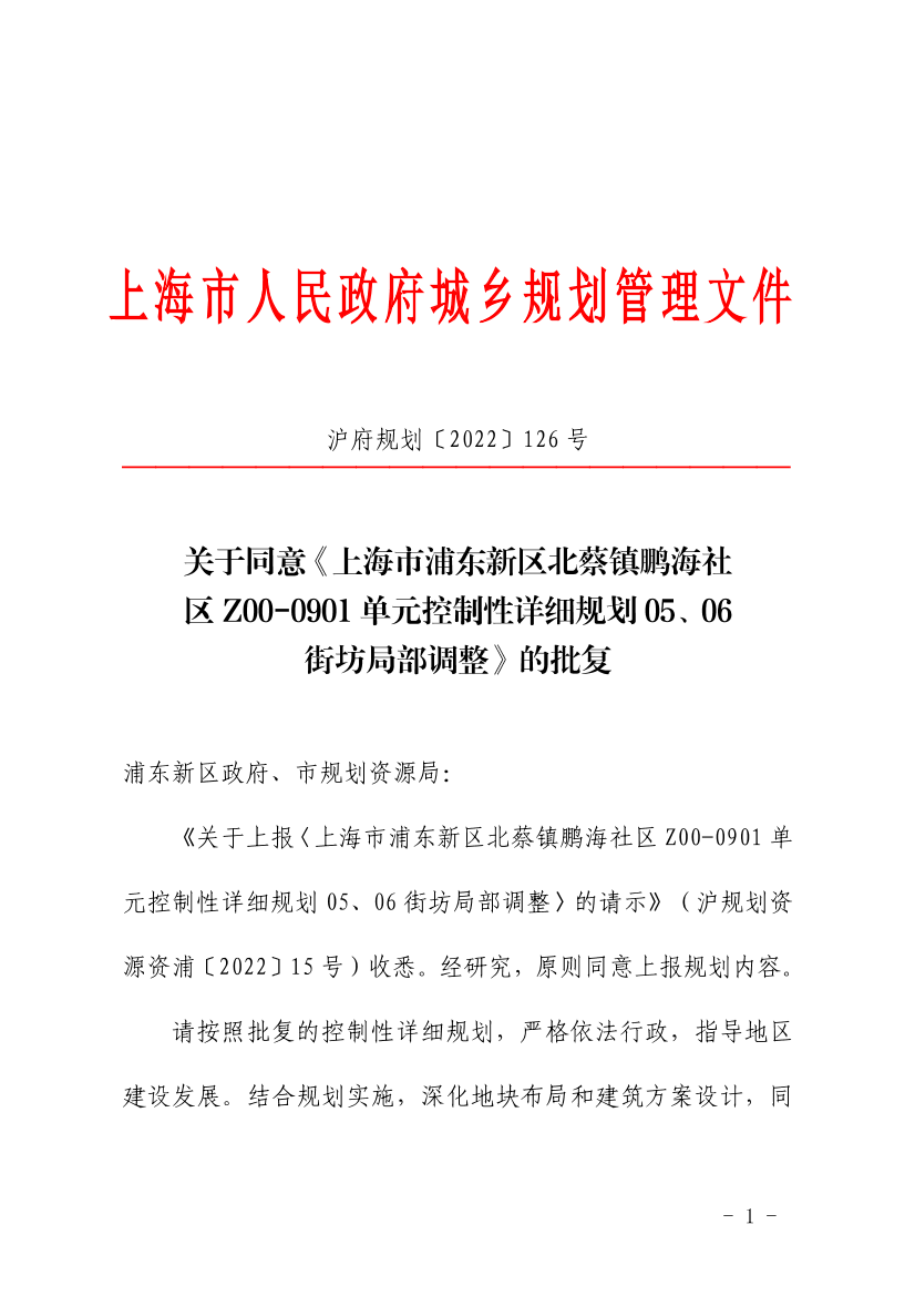 《关于上报〈上海市浦东新区北蔡镇鹏海社区Z00-0901单元控制性详细规划05、06街坊局部调整〉的请示》(沪规划资源资浦〔2022〕15号)收悉。经研究,原则同意上报规划内容。
