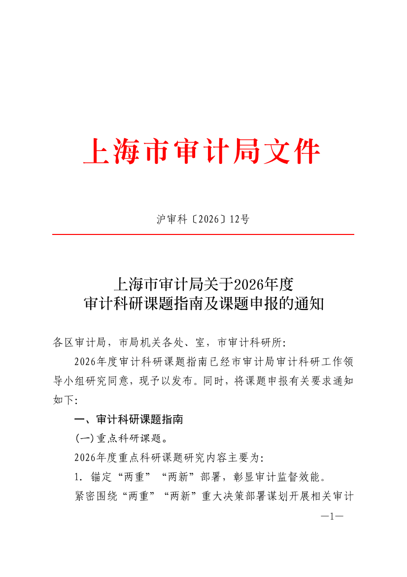 上海市审计局关于2026年度审计科研课题指南及课题申报的通知