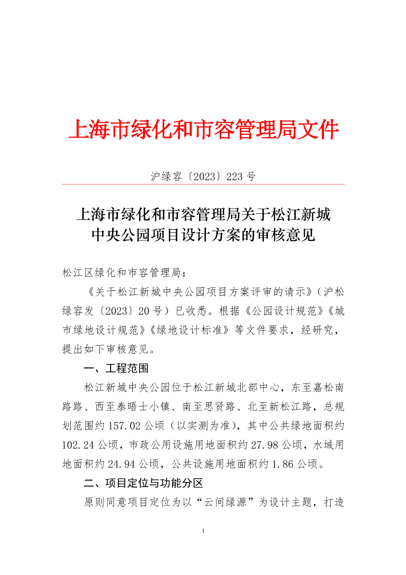 《关于松江新城中央公园项目方案评审的请示》(沪松绿容发〔2023〕20号)已收悉。根据《公园设计规范》《城市绿地设计规范》《绿地设计标准》等文件要求,经研究,提出如下审核意见。