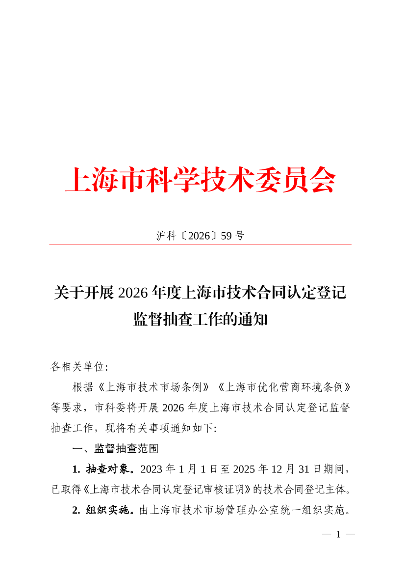 根据《上海市技术市场条例》《上海市优化营商环境条例》等要求,市科委将开展2026年度上海市技术合同认定登记监督抽查工作,现将有关事项通知如下: