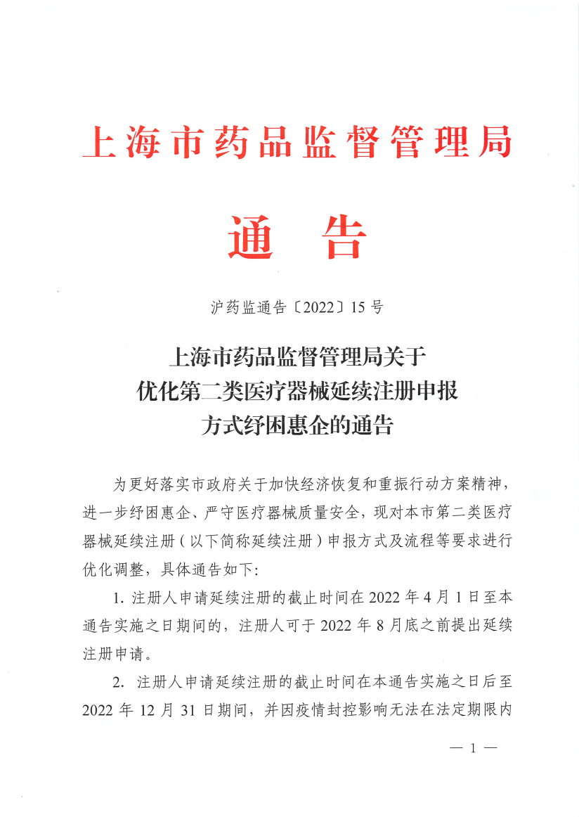 为更好落实市政府关于加快经济恢复和重振行动方案精神,进一步纾困惠企、严守医疗器械质量安全,现对本市第二类医疗器械延续注册(以下简称延续注册)申报方式及流程等要求进行优化调整,具体通告如下: