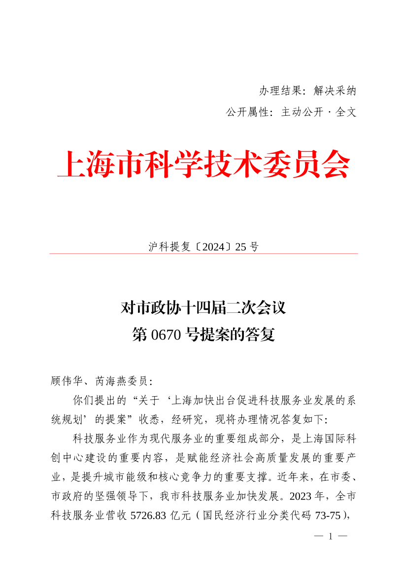 你们提出的“关于‘上海加快出台促进科技服务业发展的系统规划’的提案”收悉,经研究,现将办理情况答复如下: