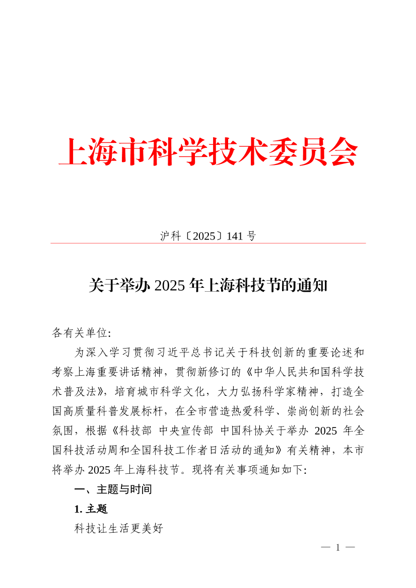 为深入学习贯彻习近平总书记关于科技创新的重要论述和考察上海重要讲话精神,贯彻新修订的《中华人民共和国科学技术普及法》,培育城市科学文化,大力弘扬科学家精神,打造全国高质量科普发展标杆,在全市营造热爱科学、崇尚创新的社会氛围,根据《科技部 中央宣传部 中国科协关于举办2025年全国科技活动周和全国科技工作者日活动的通知》有关精神,本市将举办2025年上海科技节。现将有关事项通知如下: