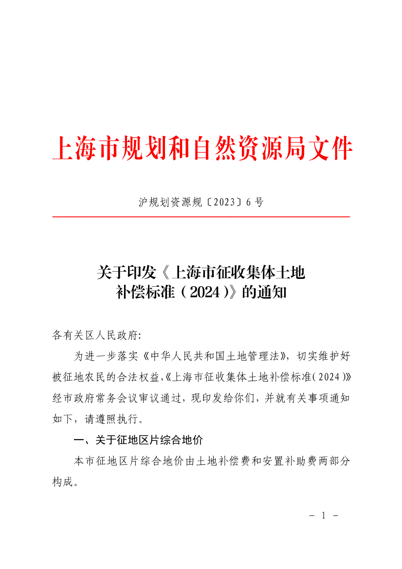 关于印发《上海市征收集体土地补偿标准(2024)》的通知