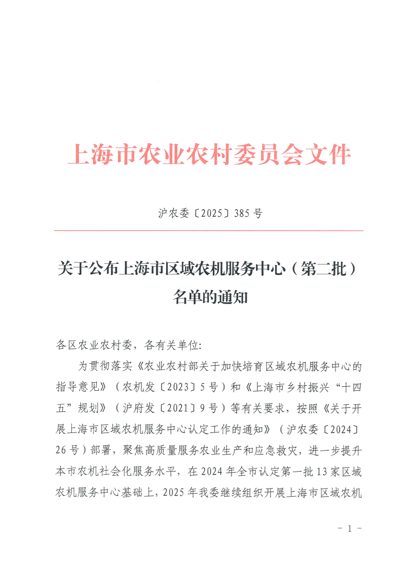 为贯彻落实《农业农村部关于加快培育区域农机服务中心的指导意见》(农机发〔2023〕5号)和《上海市乡村振兴“十四五”规划》(沪府发〔2021〕9号)等有关要求,按照《关于开展上海市区域农机服务中心认定工作的通知》(沪农委〔2024〕26号)部署,聚焦高质量服务农业生产和应急救灾,进一步提升本市农机社会化服务水平,在2024年全市认定第一批13家区域农机服务中心基础上,2025年我委继续组织开展上海市区域农机服务中心遴选认定工作。经区级遴选申报、市级评审认定、社会公示等程序,确定上海红磊农业发展有限公司等本市14家农机作业服务组织为上海市区域农机服务中心(第二批),现予以公布(名单见附件)。