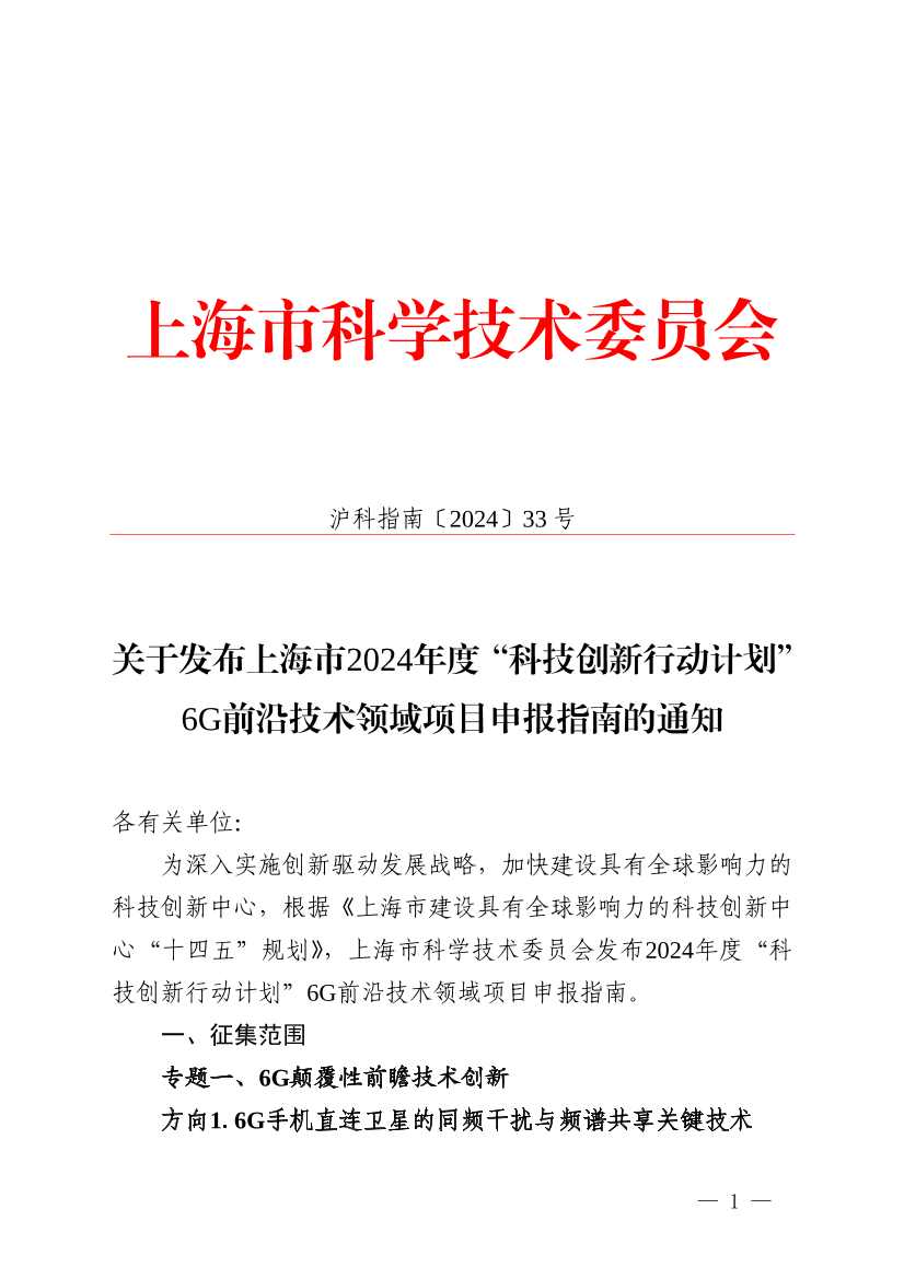 为深入实施创新驱动发展战略,加快建设具有全球影响力的科技创新中心,根据《上海市建设具有全球影响力的科技创新中心“十四五”规划》,上海市科学技术委员会发布2024年度“科技创新行动计划”6G前沿技术领域项目申报指南。