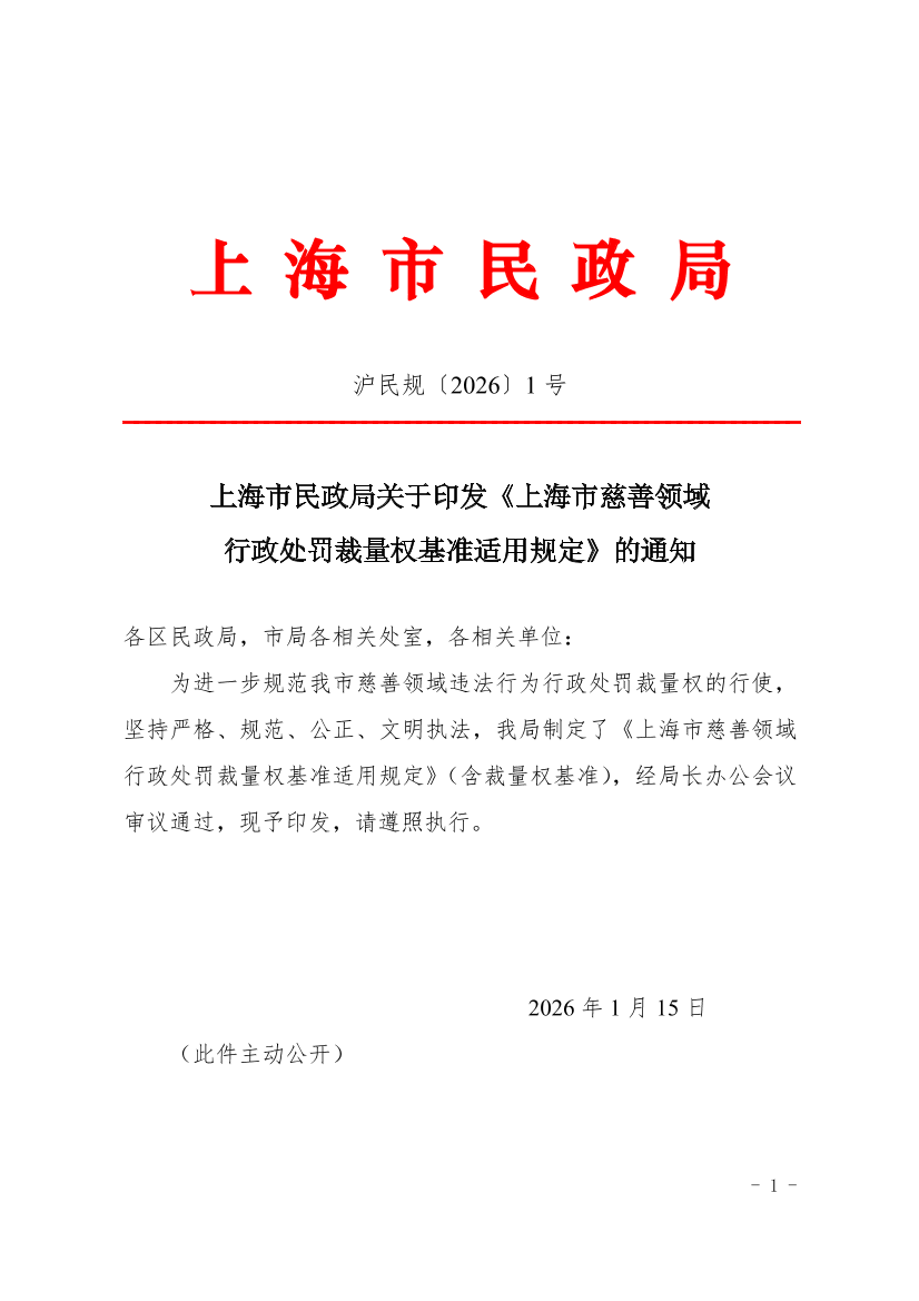 为进一步规范我市慈善领域违法行为行政处罚裁量权的行使,坚持严格、规范、公正、文明执法,我局制定了《上海市慈善领域行政处罚裁量权基准适用规定》(含裁量权基准),经局长办公会议审议通过,现予印发,请遵照执行。