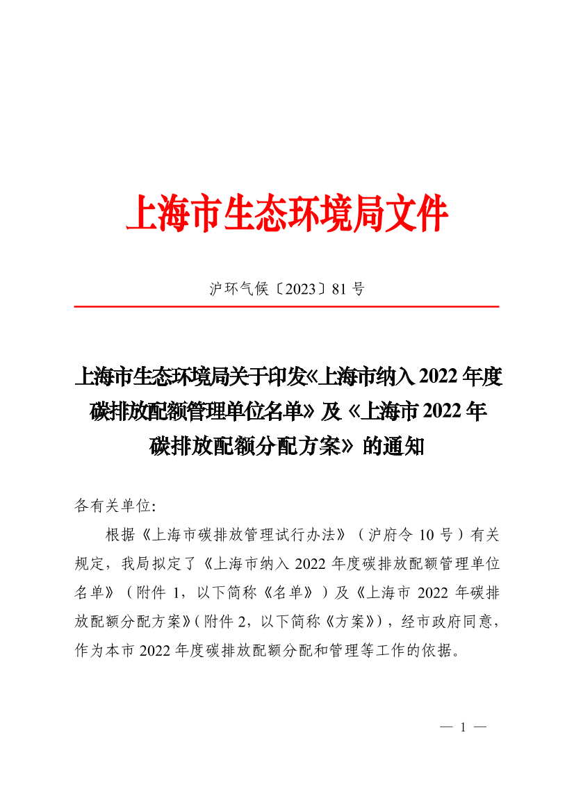 根据《上海市碳排放管理试行办法》(沪府令10号)有关规定,我局拟定了《上海市纳入2022年度碳排放配额管理单位名单》(附件1,以下简称《名单》)及《上海市2022年碳排放配额分配方案》(附件2,以下简称《方案》),经市政府同意,作为本市2022年度碳排放配额分配和管理等工作的依据。