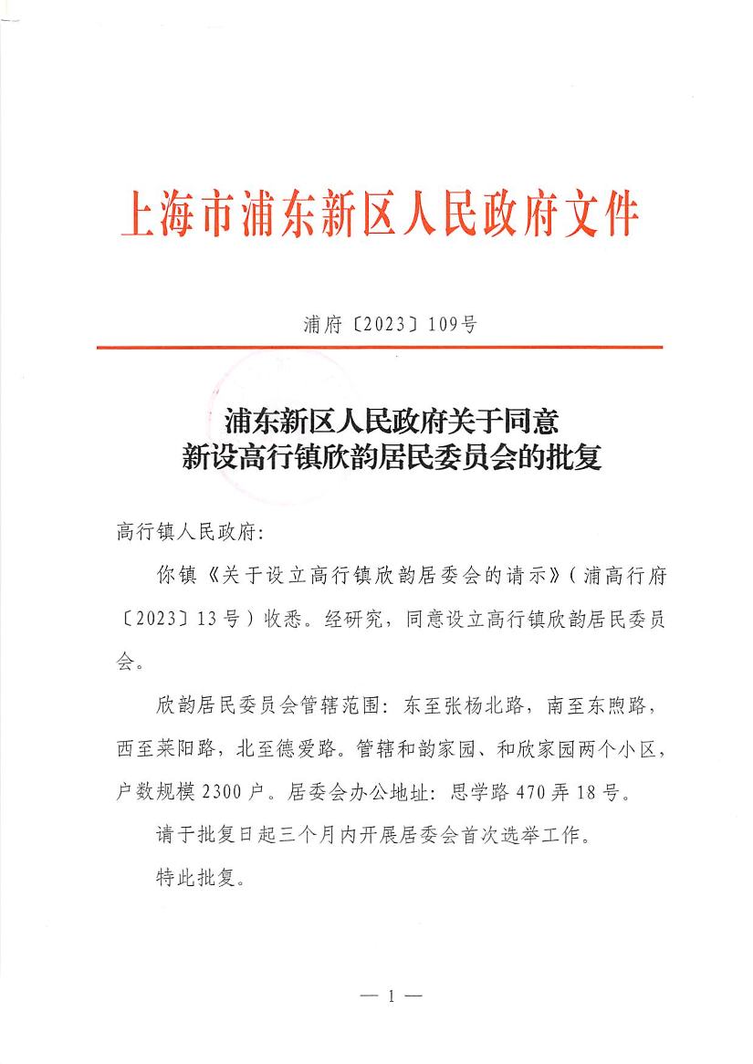 你镇《关于设立高行镇欣韵居委会的请示》(浦高行府〔2023〕13号)收悉。经研究,同意设立高行镇欣韵居民委员会。