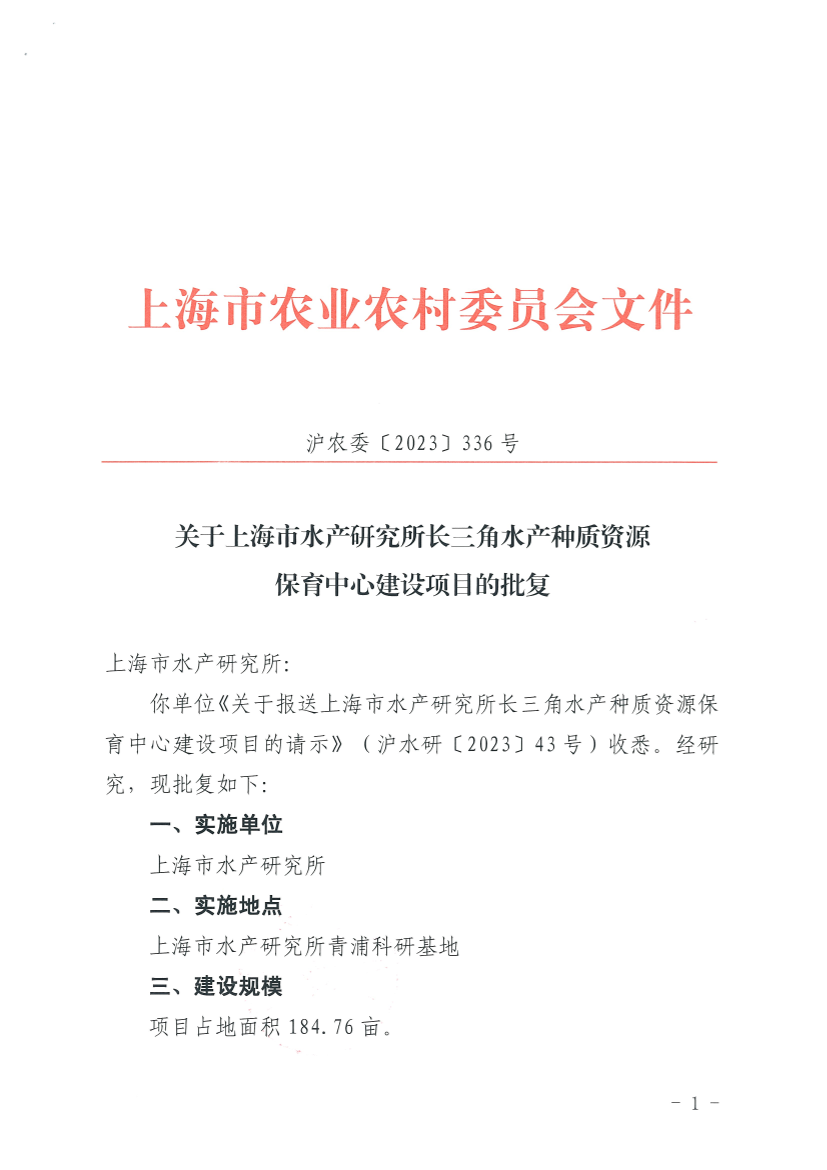 你单位《关于报送上海市水产研究所长三角水产种质资源保育中心建设项目的请示》(沪水研〔2023〕43号)收悉。经研究,现批复如下: