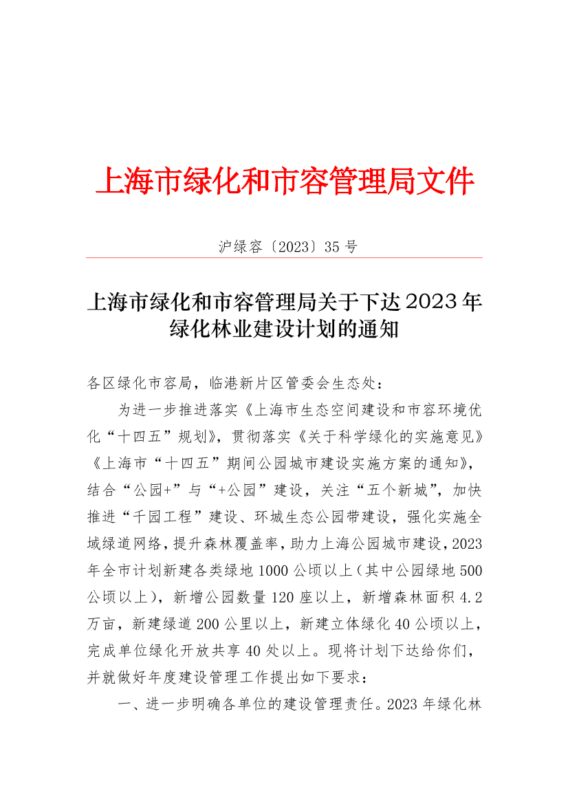 为进一步推进落实《上海市生态空间建设和市容环境优化“十四五”规划》,贯彻落实《关于科学绿化的实施意见》《上海市“十四五”期间公园城市建设实施方案的通知》,结合“公园+”与“+公园”建设,关注“五个新城”,加快推进“千园工程”建设、环城生态公园带建设,强化实施全域绿道网络,提升森林覆盖率,助力上海公园城市建设,2023年全市计划新建各类绿地1000公顷以上(其中公园绿地500公顷以上),新增公园数量120座以上,新增森林面积4.2万亩,新建绿道200公里以上,新建立体绿化40公顷以上,完成单位绿化开放共享40处以上。现将计划下达给你们,并就做好年度建设管理工作提出如下要求: