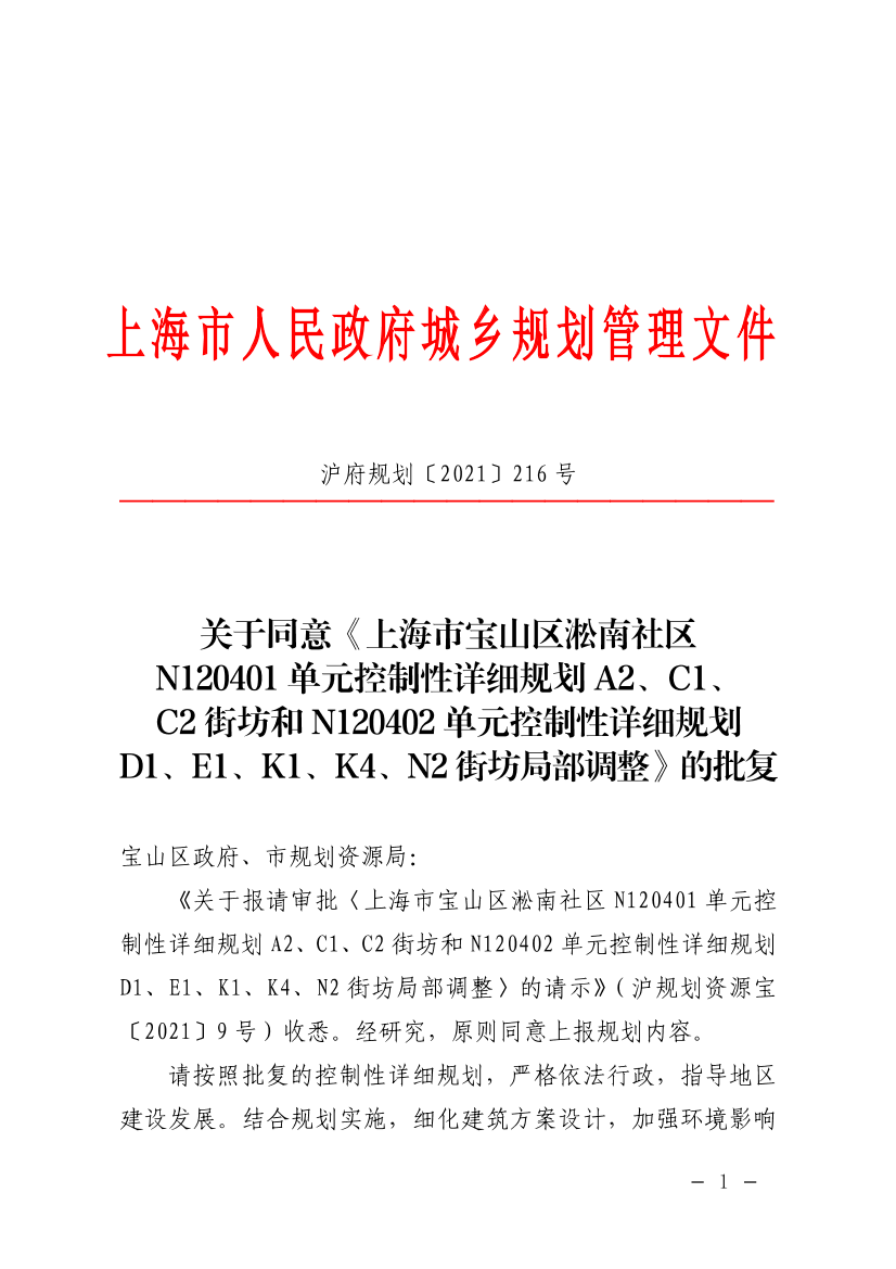 《关于报请审批〈上海市宝山区淞南社区N120401单元控制性详细规划A2、C1、C2街坊和N120402单元控制性详细规划D1、E1、K1、K4、N2街坊局部调整〉的请示》(沪规划资源宝〔2021〕9号)收悉。经研究,原则同意上报规划内容。