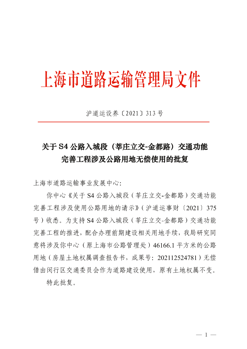 你中心《关于S4公路入城段(莘庄立交-金都路)交通功能完善工程涉及使用公路用地的请示》(沪道运事财〔2021〕375号)收悉。为支持S4公路入城段(莘庄立交-金都路)交通功能完善工程的推进,配合办理前期建设相关用地手续,我局研究同意将涉及你中心(原上海市公路管理处)46166.1平方米的公路用地(房屋土地权属调查报告书,成果号:202112524781)无偿借由闵行区交通委员会作为道路建设使用,原有土地权属不变。