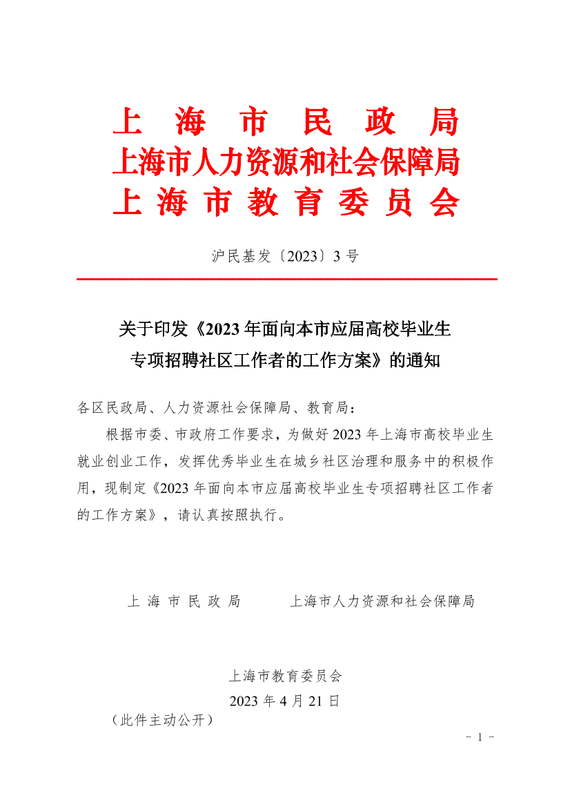 根据市委、市政府工作要求,为做好2023年上海市高校毕业生就业创业工作,发挥优秀毕业生在城乡社区治理和服务中的积极作用,现制定《2023年面向本市应届高校毕业生专项招聘社区工作者的工作方案》,请认真按照执行。