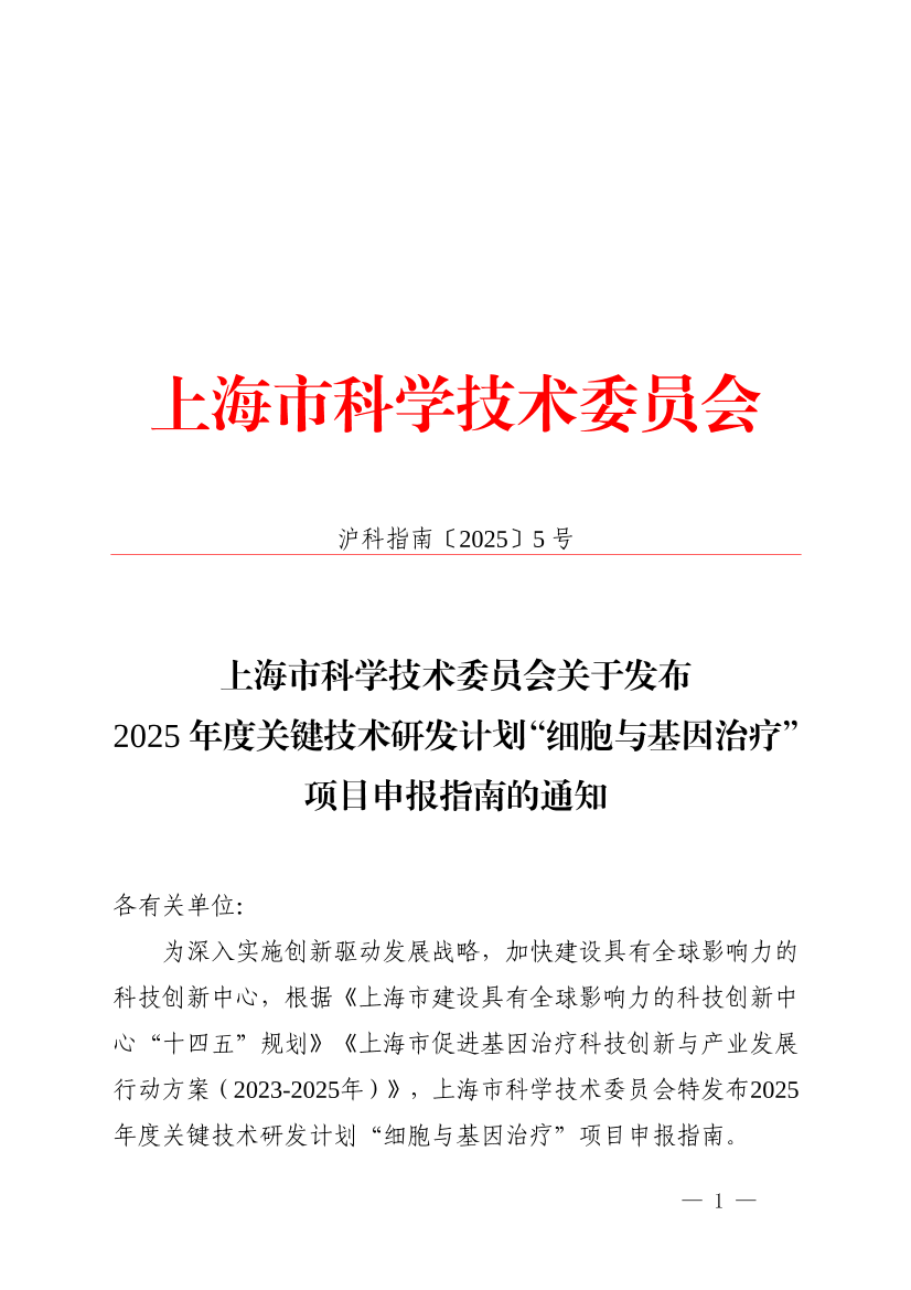 为深入实施创新驱动发展战略,加快建设具有全球影响力的科技创新中心,根据《上海市建设具有全球影响力的科技创新中心“十四五”规划》《上海市促进基因治疗科技创新与产业发展行动方案(2023-2025年)》,上海市科学技术委员会特发布2025年度关键技术研发计划“细胞与基因治疗”项目申报指南。
