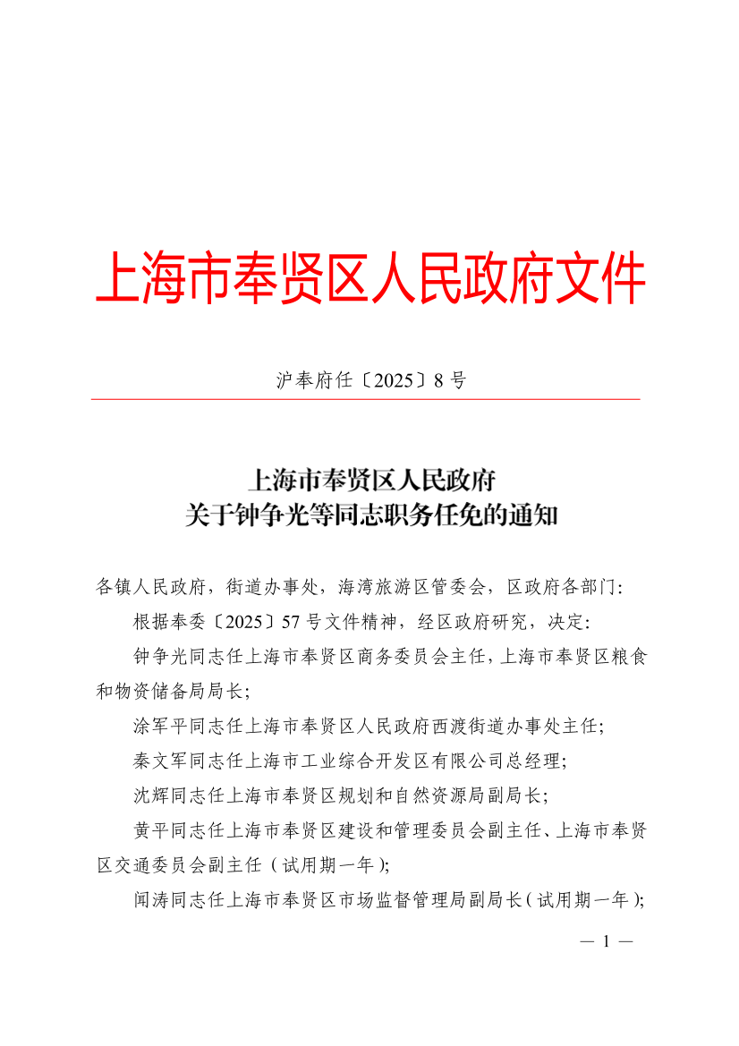 钟争光同志任上海市奉贤区商务委员会主任,上海市奉贤区粮食和物资储备局局长;