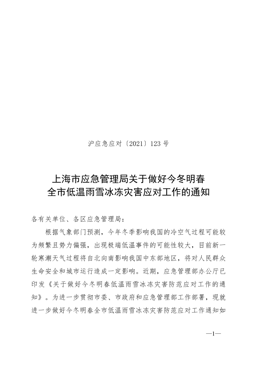 根据气象部门预测,今年冬季影响我国的冷空气过程可能较为频繁且势力偏强,出现极端低温事件的可能性较大,目前新一轮寒潮天气过程将自北向南影响我国中东部地区,将对人民群众生命安全和城市运行造成一定影响。近期,应急管理部办公厅已印发《关于做好今冬明春低温雨雪冰冻灾害防范应对工作的通知》。为进一步贯彻市委、市政府和应急管理部工作部署,现就进一步做好今冬明春全市低温雨雪冰冻灾害防范应对工作通知如下。