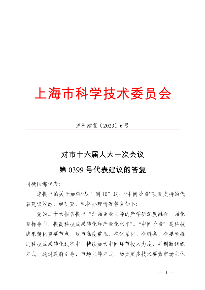 您提出的关于加强“从1到10”这一“中间阶段”项目支持的代表建议收悉,经研究,现将办理情况答复如下: