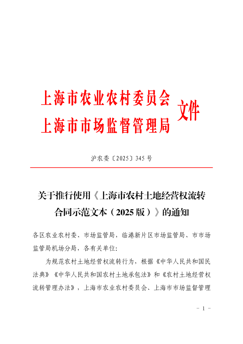 为规范农村土地经营权流转行为,根据《中华人民共和国民法典》《中华人民共和国农村土地承包法》和《农村土地经营权流转管理办法》,上海市农业农村委员会、上海市市场监督管理局联合对《上海市农村土地经营权流转合同示范文本(2019版)》进行了修订,制定了《上海市农村土地经营权流转合同示范文本(2025版)》(以下简称《土地经营权流转合同》),并决定自2026年1月1日起在全市范围内推行使用。现就有关事项通知如下:
