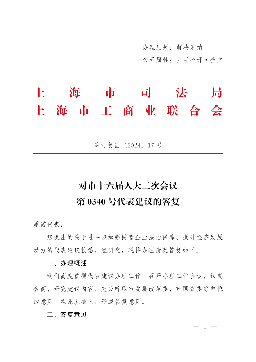 您提出的关于进一步加强民营企业法治保障、提升经济发展动力的代表建议收悉。经研究,现将办理情况答复如下: