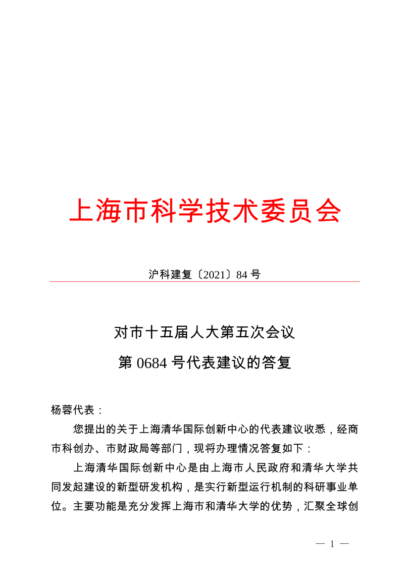 您提出的关于上海清华国际创新中心的代表建议收悉,经商市科创办、市财政局等部门,现将办理情况答复如下: