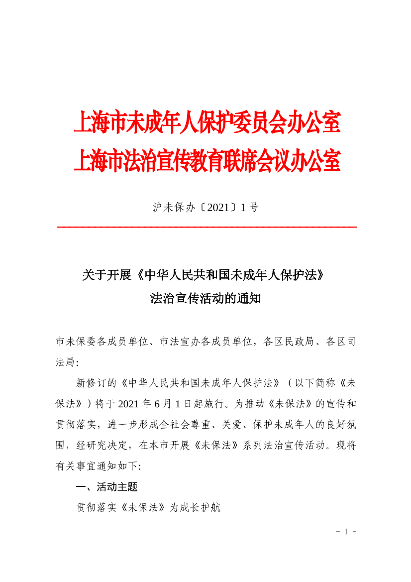 新修订的《中华人民共和国未成年人保护法》(以下简称《未保法》)将于2021年6月1日起施行。为推动《未保法》的宣传和贯彻落实,进一步形成全社会尊重、关爱、保护未成年人的良好氛围,经研究决定,在本市开展《未保法》系列法治宣传活动。现将有关事宜通知如下: