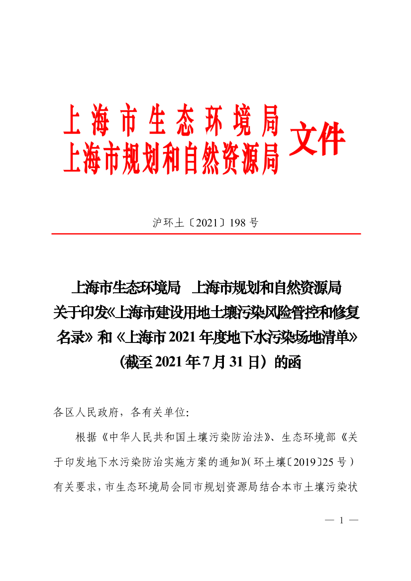 根据《中华人民共和国土壤污染防治法》、生态环境部《关于印发地下水污染防治实施方案的通知》(环土壤〔2019〕25号)有关要求,市生态环境局会同市规划资源局结合本市土壤污染状况相关评审情况(截至2021年7月31日),将《上海市建设用地土壤污染风险管控和修复名录(截至2021年4月30日)》中的“松江经开区中部园区SJC1-00013单元05街坊02地块”等6个可安全利用的地块移出名录(附件1);新增“桃浦智创城624(规划032-01、032-02部分区域)地块”等7个需实施风险管控、修复的地块,同时根据名录中地块地下水污染治理修复情况,将“桃浦智创城621(立科化学、春光村)地块(又名621B地块)”等2个地块移出上海市地下水污染场地清单(附件3),新增将“上海市嘉定新城F03-4地块”移入上海市地下水污染场地清单。现将《上海市建设用地土壤污染风险管控和修复名录》(附件2,以下简称名录)及《上海市2021年度地下水污染场地清单》(附件4,以下简称清单)(截至2021年7月31日)印发你们。