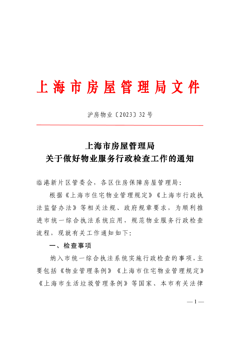 根据《上海市住宅物业管理规定》《上海市行政执法监督办法》等相关法规、政府规章要求,为顺利推进市统一综合执法系统应用,规范物业服务行政检查流程,现就有关工作通知如下: