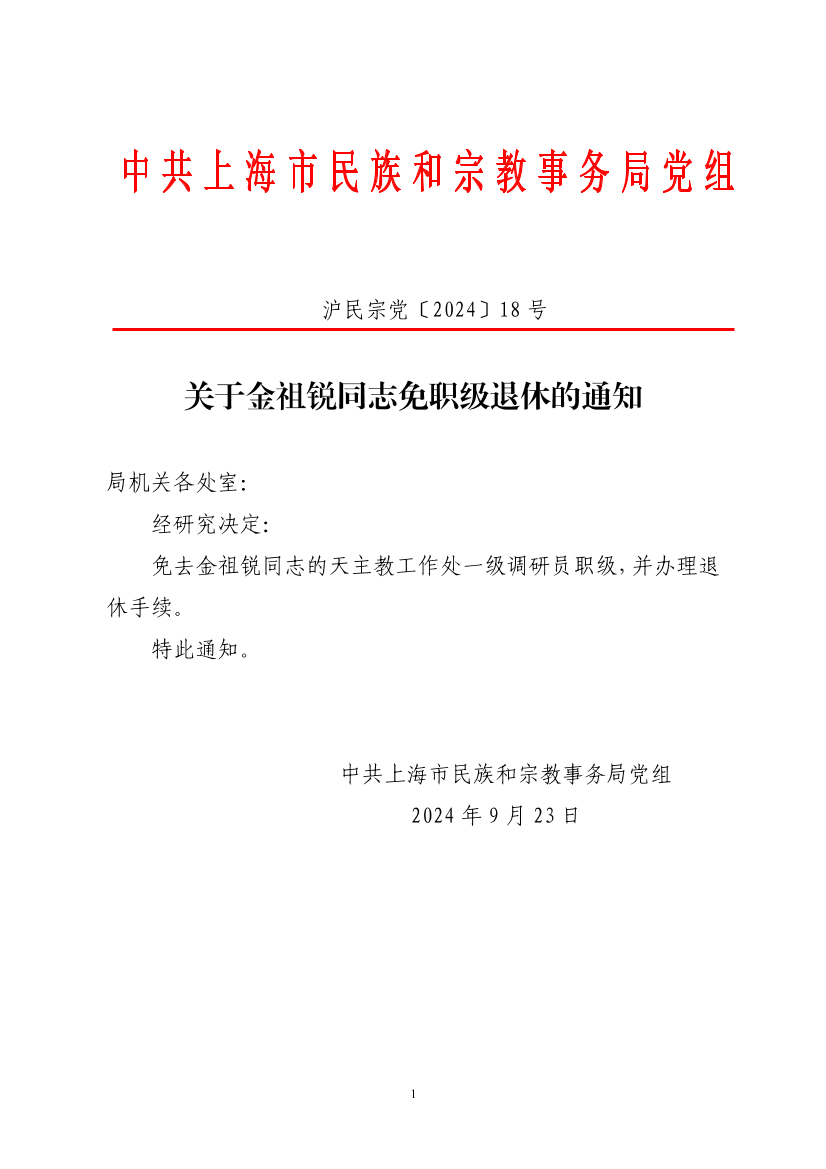 免去金祖锐同志的天主教工作处一级调研员职级,并办理退休手续。