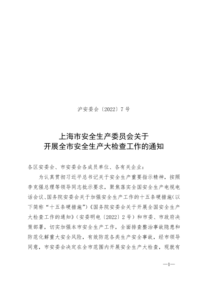 为认真贯彻习近平总书记关于安全生产重要指示精神,按照李克强总理等领导同志批示要求,聚焦落实全国安全生产电视电话会议、国务院安委会关于加强安全生产工作的十五条硬措施(以下简称“十五条硬措施”)《国务院安委会关于开展全国安全生产大检查工作的通知》(安委明电〔2022〕2号)和市委、市政府决策部署,切实加强本市安全生产工作,全面排查整治事故隐患和防范化解重大安全风险,有效防范各类生产安全事故,经市领导同意,市安委会决定在全市范围内开展安全生产大检查,现就有关事项通知如下。