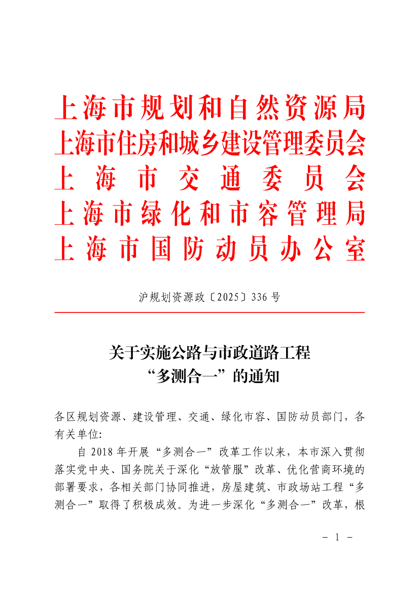 自2018年开展“多测合一”改革工作以来,本市深入贯彻落实党中央、国务院关于深化“放管服”改革、优化营商环境的部署要求,各相关部门协同推进,房屋建筑、市政场站工程“多测合一”取得了积极成效。为进一步深化“多测合一”改革,根据《国务院关于开展营商环境创新试点工作的意见》《上海市营商环境创新试点实施方案》和自然资源部关于深化工程建设项目“多测合一”改革的工作要求,逐步扩大改革范围,现就实施公路与市政道路工程“多测合一”工作通知如下: