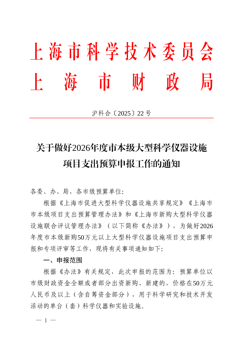 根据《上海市促进大型科学仪器设施共享规定》《上海市市本级项目支出预算管理办法》和《上海市新购大型科学仪器设施联合评议管理办法》(以下简称《办法》),为做好2026年度市本级新购50万元以上大型科学仪器设施项目支出预算申报和专项评审等工作,现将有关事项通知如下: