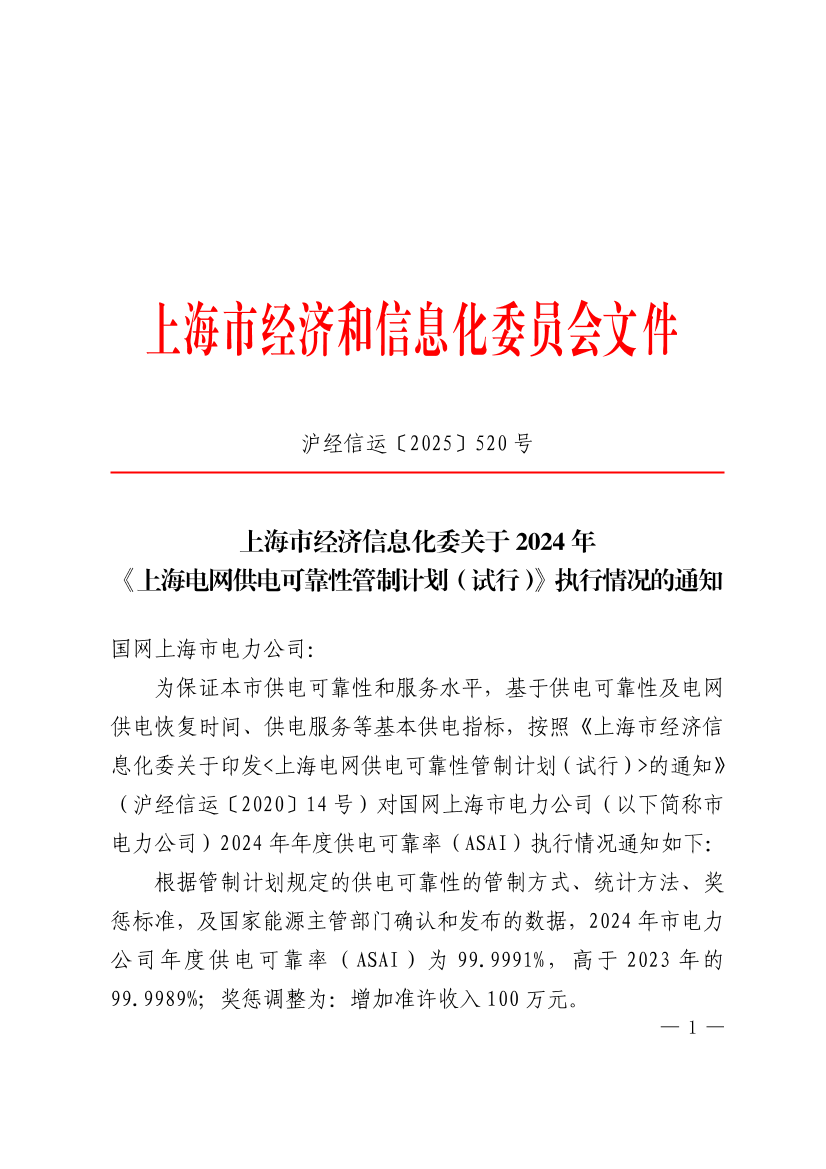 为保证本市供电可靠性和服务水平,基于供电可靠性及电网供电恢复时间、供电服务等基本供电指标,按照《上海市经济信息化委关于印发<上海电网供电可靠性管制计划(试行)>的通知》(沪经信运〔2020〕14号)对国网上海市电力公司(以下简称市电力公司)2024年年度供电可靠率(ASAI)执行情况通知如下:
