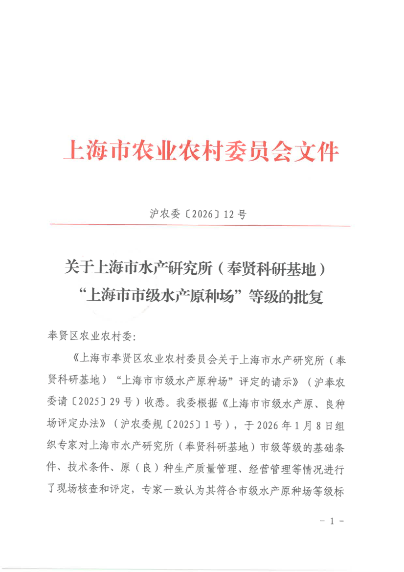 《上海市奉贤区农业农村委员会关于上海市水产研究所(奉贤科研基地)“上海市市级水产原种场”评定的请示》(沪奉农委请〔2025〕29号)收悉。我委根据《上海市市级水产原、良种场评定办法》(沪农委规〔2025〕1号),于2026年1月8日组织专家对上海市水产研究所(奉贤科研基地)市级等级的基础条件、技术条件、原(良)种生产质量管理、经营管理等情况进行了现场核查和评定,专家一致认为其符合市级水产原种场等级标准。经公示,未收到任何异议。