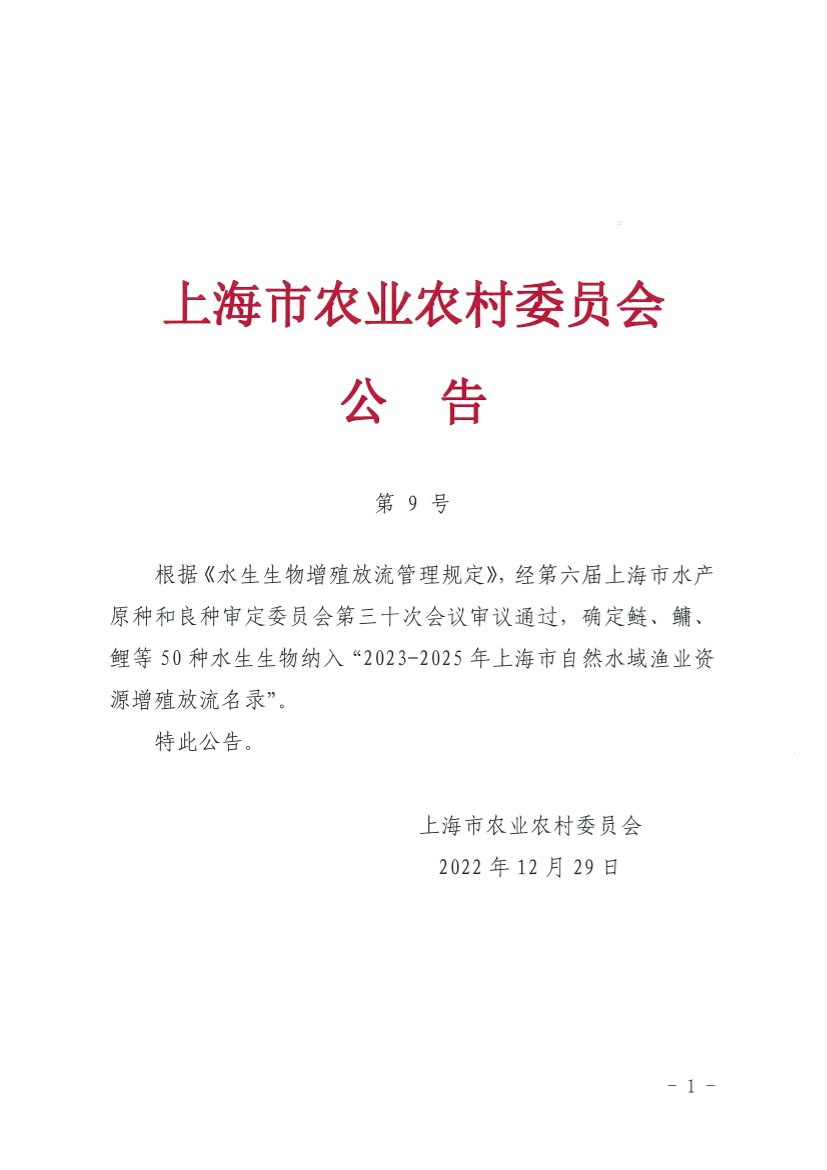 根据《水生生物增殖放流管理规定》,经第六届上海市水产原种和良种审定委员会第三十次会议审议通过,确定鲢、鳙、鲤等50种水生生物纳入“2023-2025年上海市自然水域渔业资源增殖放流名录”。